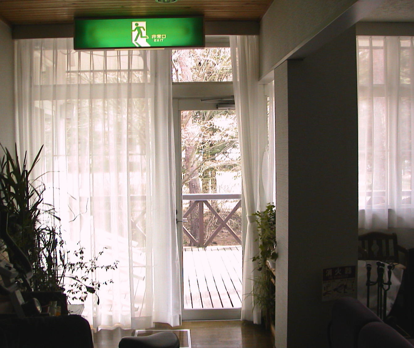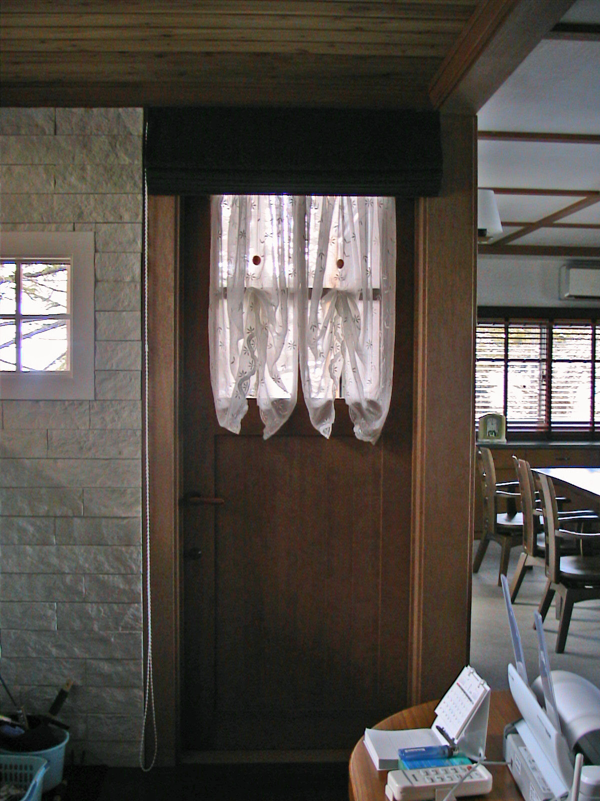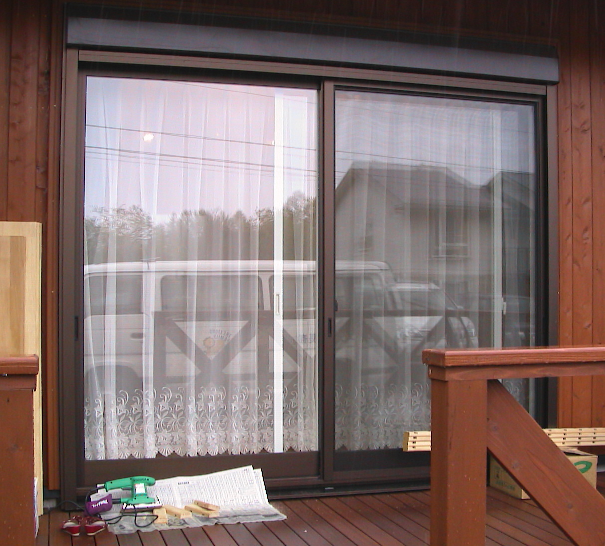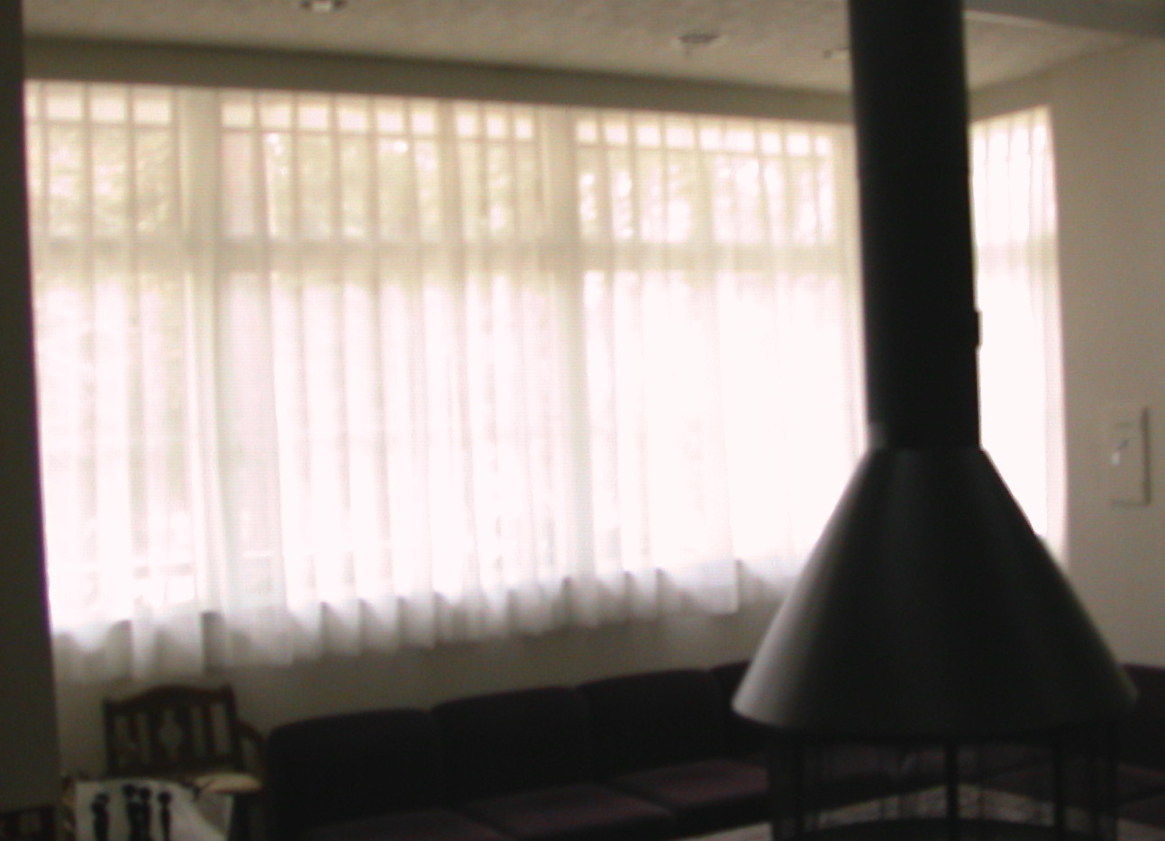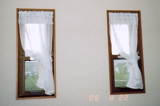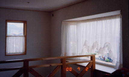 ボイルレースをリフレ ホワイトレールと テンションポールで下げました。 2F 吹抜けなのでドレープは無し。 |